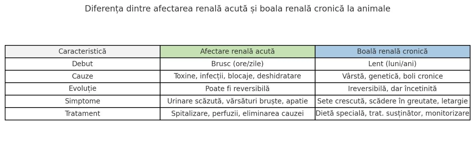 Rinichii joacă un rol esențial în sănătatea câinilor și pisicilor: filtrează sângele, elimină toxinele și mențin echilibrul apei și al mineralelor din organism. Când rinichii nu mai funcționează corect, apar probleme grave, care determină afectare renală acută sau boală renală cronică. Deși ambele afectează rinichii, diferențele dintre ele sunt importante și ajută medicul veterinar să stabilească tratamentul corect.
